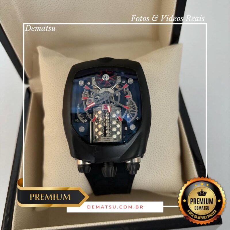 Réplica Premium do Jacob & Co Bugatti Chiron Tourbillon na Dematsu: A réplica do Jacob & Co Bugatti Chiron Tourbillon oferecida pela Dematsu traz todos os detalhes minuciosos e o design autêntico do modelo original. Fabricada com materiais de alta qualidade, a réplica é uma excelente opção para aqueles que buscam luxo acessível, com qualidade excepcional e acabamento impecável. Seu vidro de safira, tamanho de 50mm e a máquina automática garantem não só estética, mas também a funcionalidade e a precisão, características essenciais de qualquer modelo inspirado em alta relojoaria.